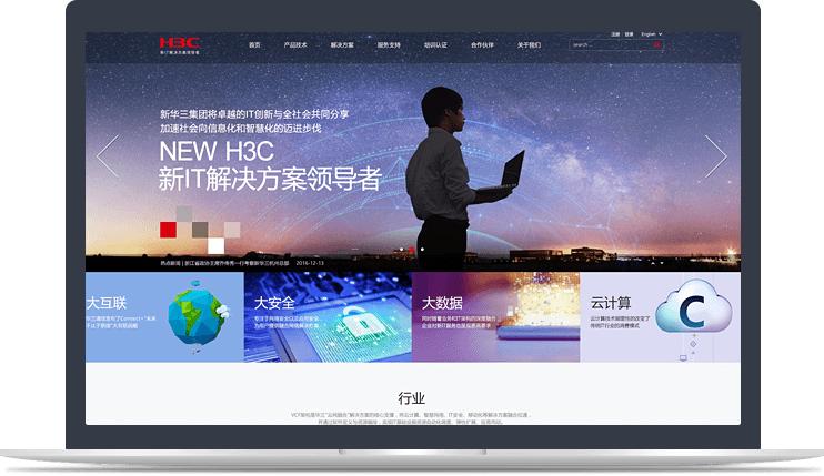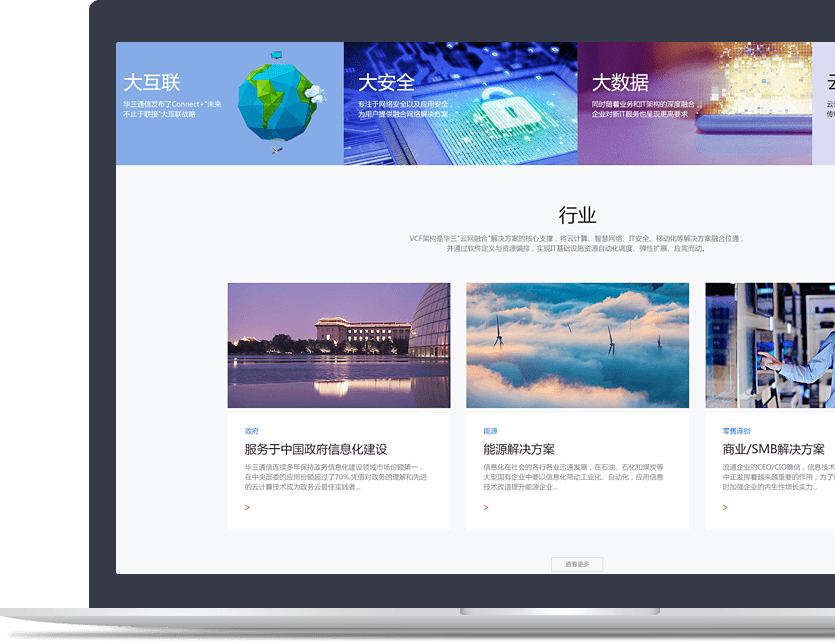 将“科技感”“创新力”融入品牌官网,顺应色块化的流行趋势,从视觉、交互、情感多维度提升品牌感知力, 成功打造H3C在互联网领域的品牌标签。