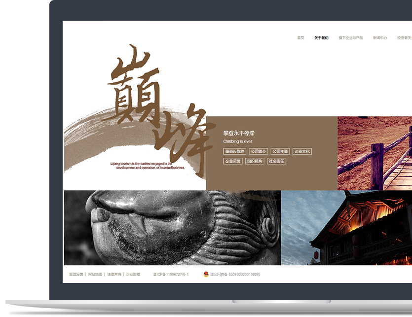 九游(中国)一站式服务官方网站利用全屏背景图的九游(中国)一站式服务官方网站设计方式,展示丽江玉龙的企业品牌形象以及丽江特色美景,将传统与时尚结合,将古典与现代结合,成功打造了一个高品质旅游类企业官网。