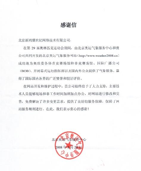 北京奥运气象服务中心在此次项目中看到了九游(中国)一站式服务官方网站的实力和努力! 并对北京奥运会气象服务网站高度满意,特此发来表扬信,以示鼓励和赞扬!